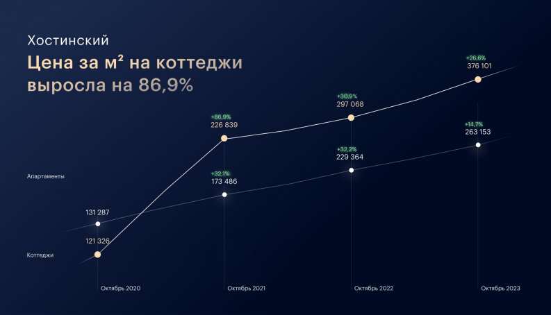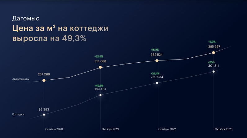 За счет повышенного спроса и ограниченного предложения цена м² коттеджей за последний год в Хостинском районе Сочи выросла на 87%, в Дагомысе на 49%. Тренд, по мнению аналитиков, сохранится еще 2 года